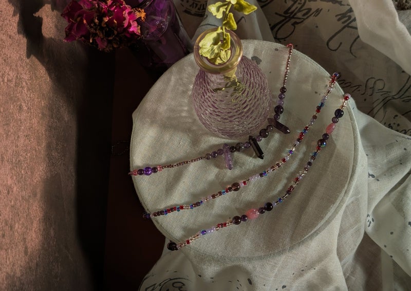these will be the limited collection sets, a higher quality with more exclusive artisanal glass beads/pendants or quartz stones. sets are made with stretchy wire, but at no cost you can email or DM us your exact sizing for high hip—hip—waistline in inches, and we can create a stiff, non-stretchy piece to fit accustom to you or your outfit. these pieces are to fit according to you or your outfit. these sets are NON-REFUNDABLE.