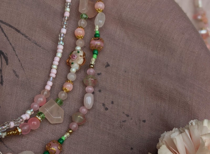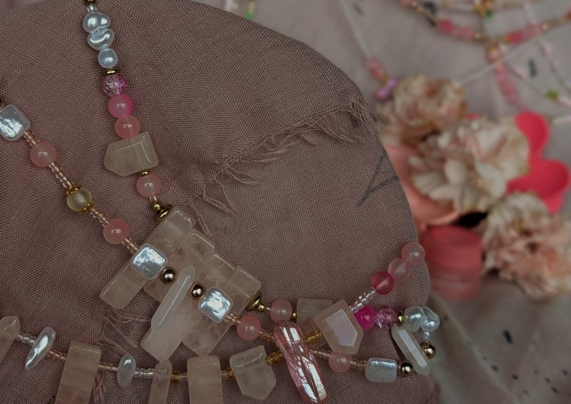 a muted, smaller version of our soft blushing crystalline. dainty, light and peppered with six shades of pink.